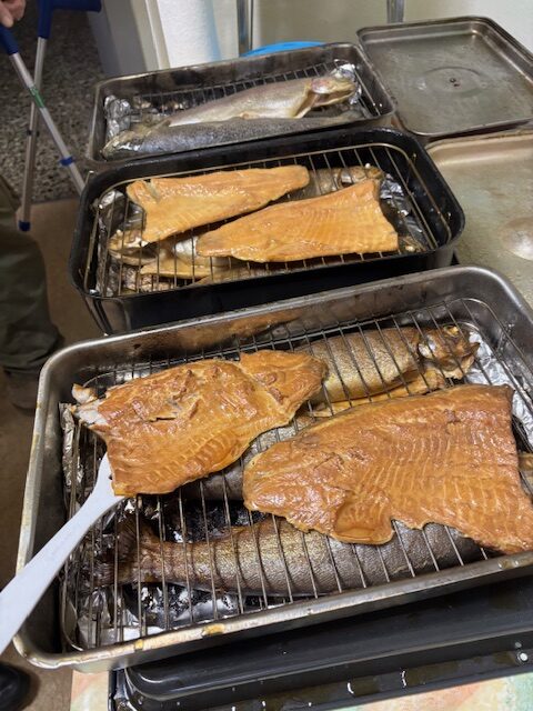 Ergänzt wurden diese Rezepte mit Kochanleitungen für klare Fischsuppe mit Gemüse, Fisch und Brätklößchen sowie gebundene Suppe mit Rauchfischfond. Nebenbei wurden Forellen und auch Karpfenfilets über Nacht in Salzlake eingelegt und anschließend in Tischräucheröfen goldgelb geräuchert.